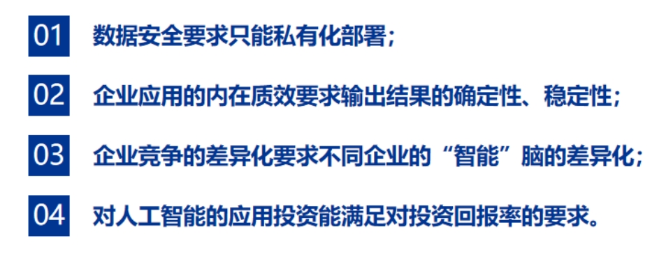 人工智能的企业侧应用有独立的特点,总结下来,有四点: